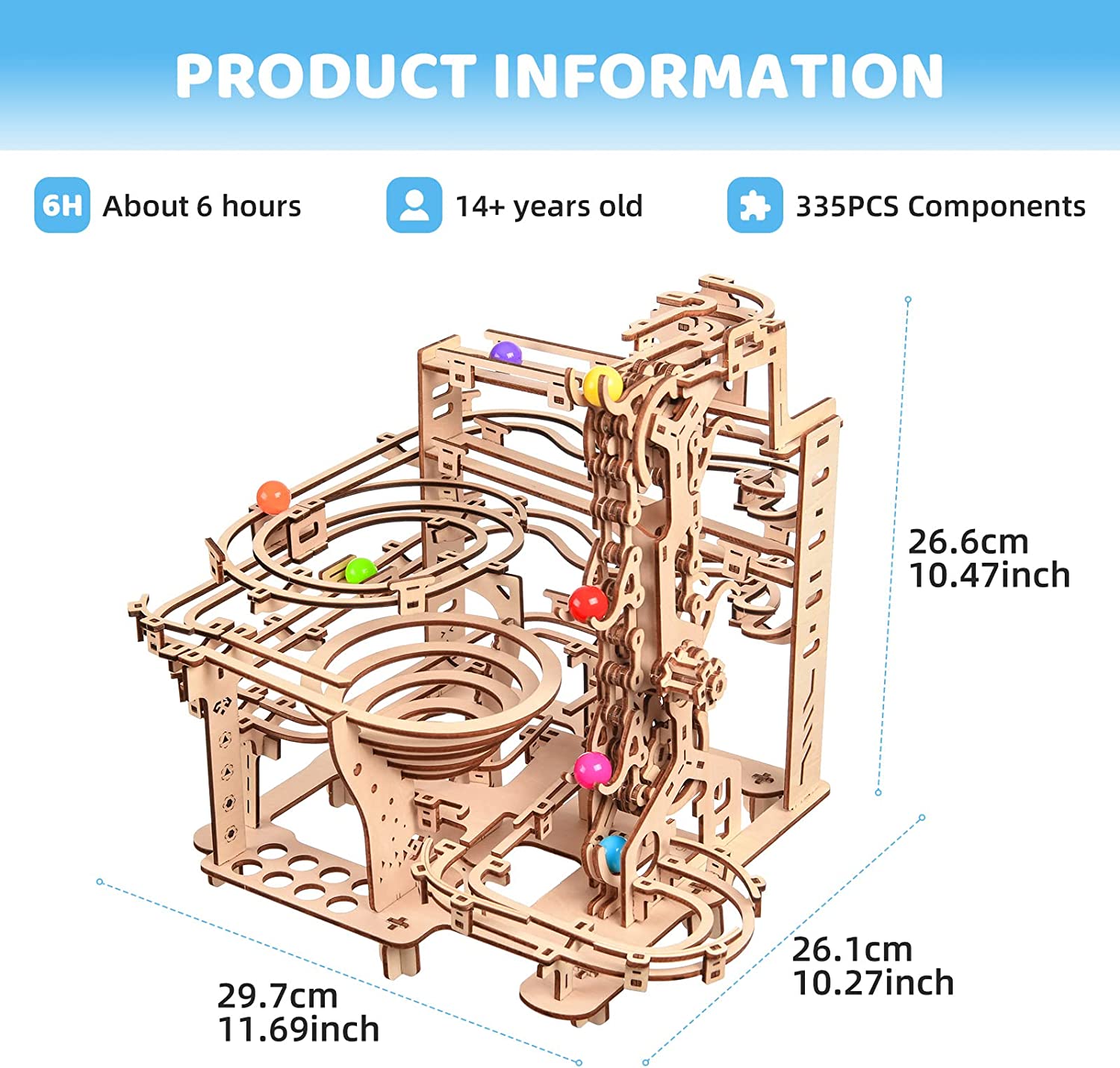 Handmade from 355 interlocking pieces of premium hardwood, this 3D puzzle assembles into a stunning 11.7 inch long, 10.43 inch wide and 10.24 inch high marble run course. An entrancing mechanical showpiece, this puzzle run comes alive with the turn of a hand crank - drop in your marbles and gawk as they zoom, swirling through chutes and loops at breakneck pace!