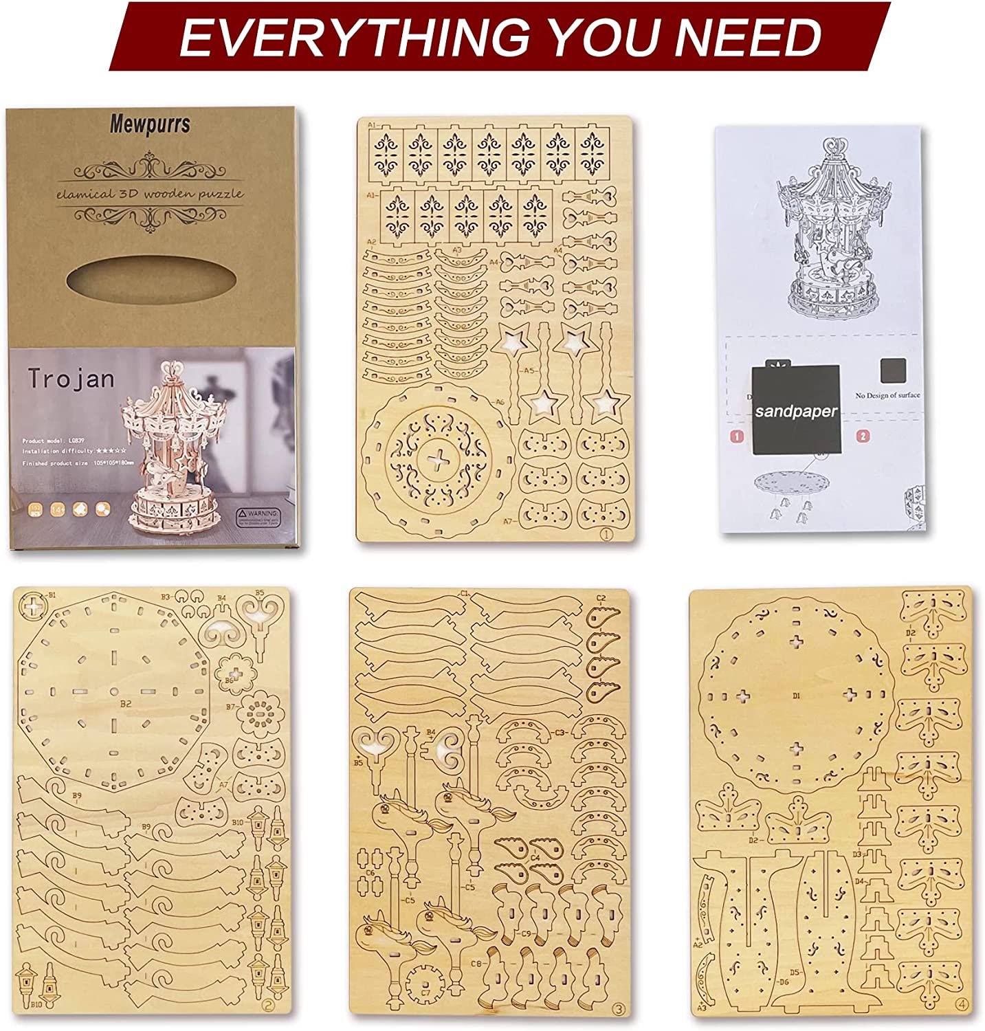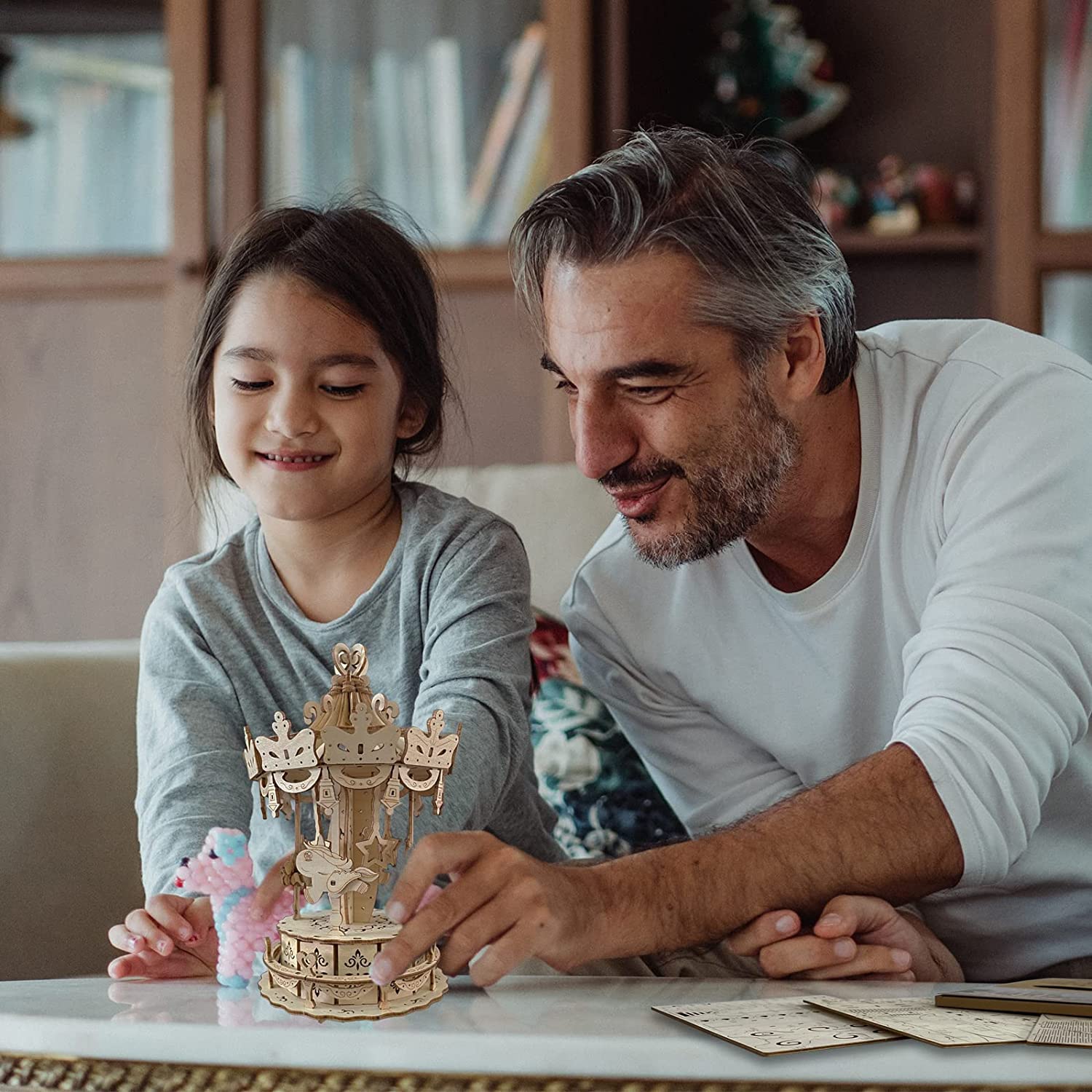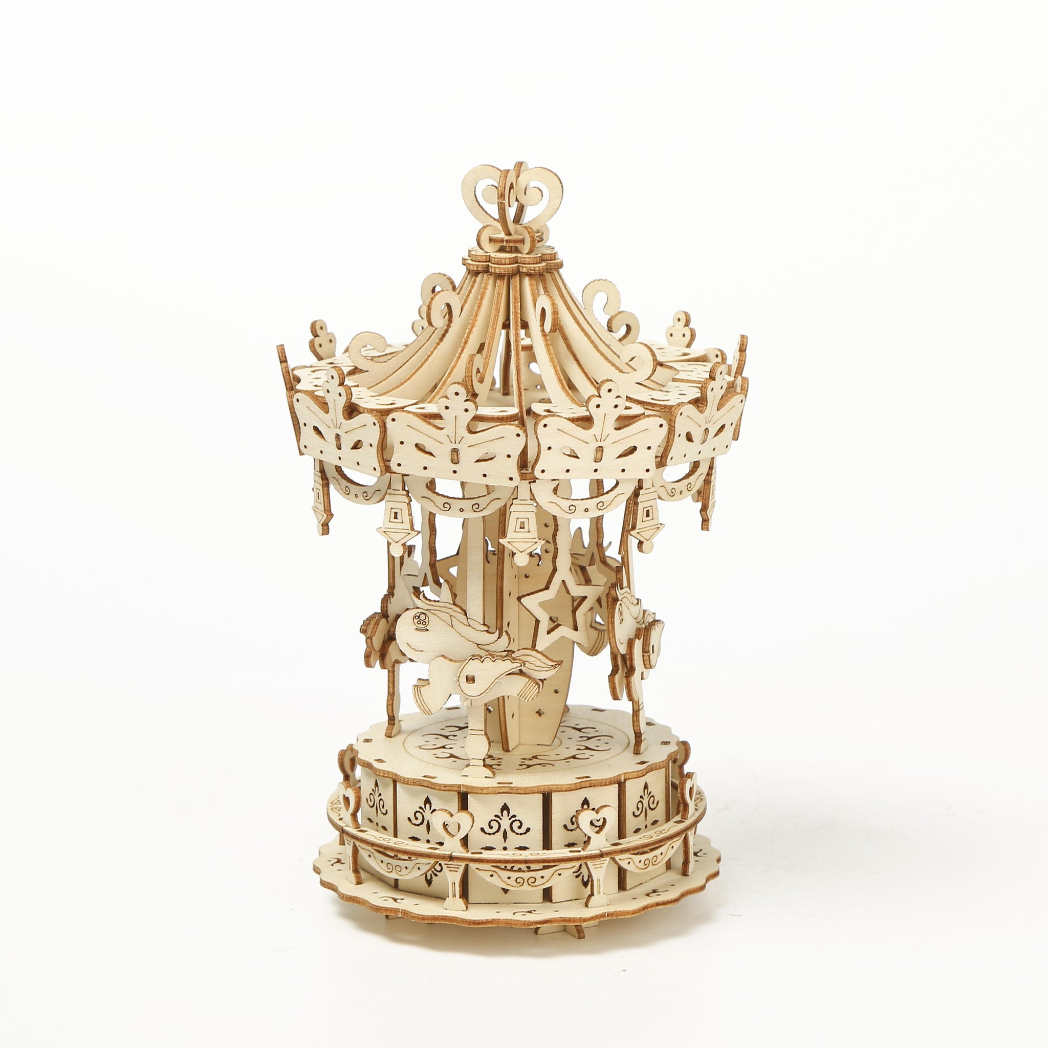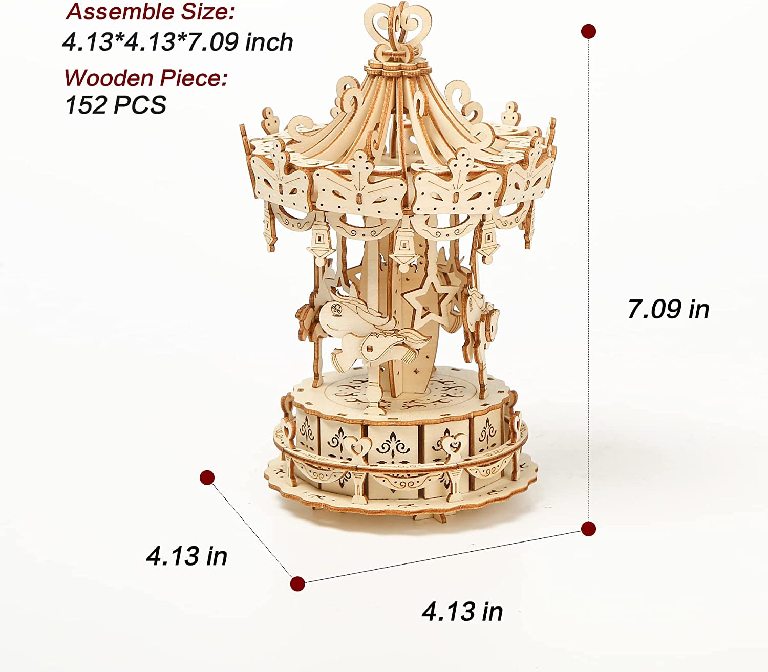 Discover wonder without end with this heirloom carousel puzzle. Handcrafted from 152 wooden pieces, this 3D puzzle assembles into a 4.13 inch long, 4.13 inch wide and 7.1inch high replica of an antique merry-go-round.