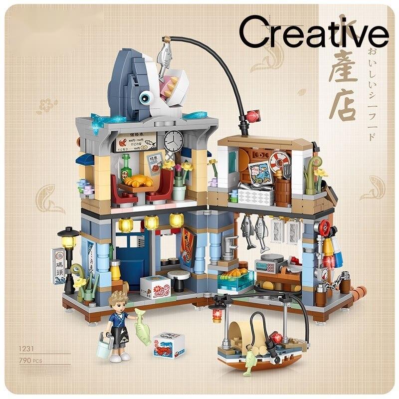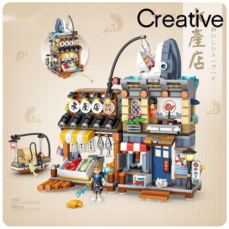 Building blocks Japanese-style street view izakaya aquatic product store mini small particles assembled toy puzzle girl boy
